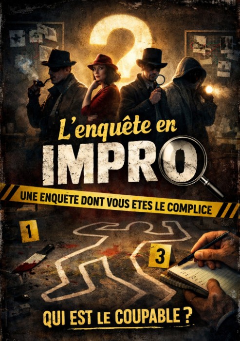 Un crime a été commis… mais rien n’est écrit à l’avance. Sur scène, plusieurs suspects, deux enquêteurs et une affaire à résoudre.