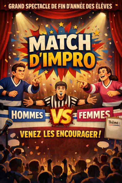 Pour le spectacle de fin d’année, les élèves adultes montent sur scène pour un match d’impro totalement explosif : Hommes vs Femmes !